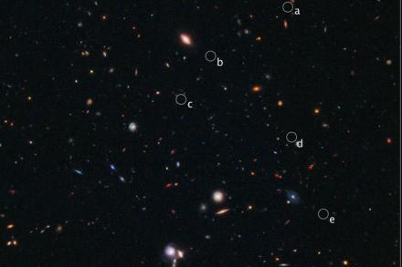 Astronomers have discovered the new record-holder for the most distant developing cluster of galaxies. Images of the cluster from the Hubble Space Telescope offer a glimpse of the universe as it was a mere 600 million years after the big bang. (The extremely faint galaxies are identified in the composite image above by the circles labeled a-e.)