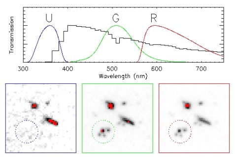 The wavelength of light from this distant galaxy has been stretched by the expansion of the universe. The Lyman limit, which would appear at 91.2 nm if you lived inside the galaxy, has been stretched to about 400 nm. Instead of using a spectrum, astronomers can simultaneously detect the presence of a Lyman-break galaxy and get a rough estimate of its distance by observing at what wavelength the Lyman break occurs photometrically — that is, at what point it disappears from images. The galaxy above was imaged in three different “bands” — astronomers often use filters to block all light from an object except for a narrow range (or band) of wavelengths — corresponding to ultraviolet, green, and red. The above galaxy is apparent in the G-band image but disappears in the U-band image. So, from the images alone, astronomers would know that the Lyman break must occur somewhere between 350 and 500 nm, and could estimate a range for its distance accordingly.
